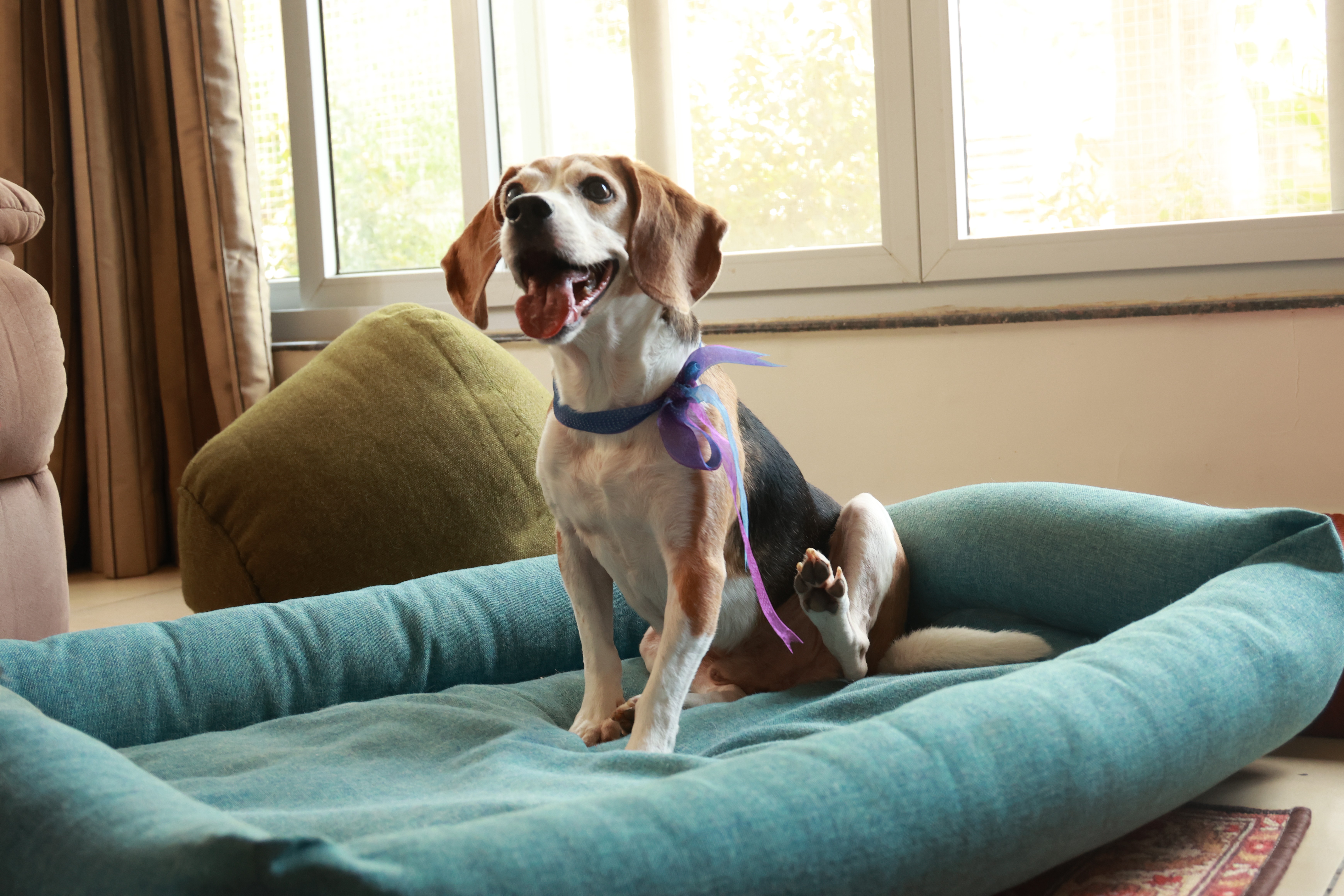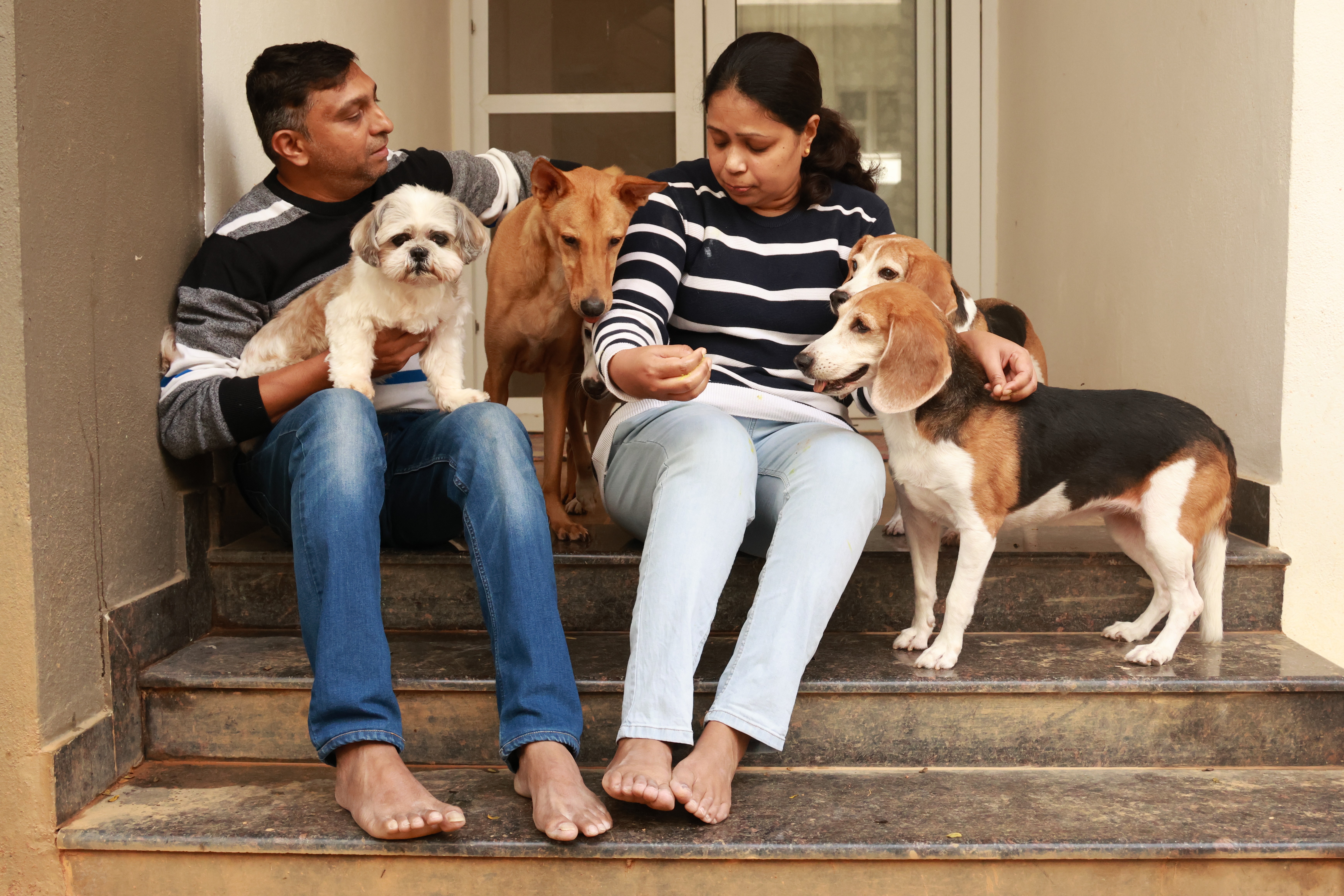 About a year after Ozzie came home, Pavithra wanted to adopt another dog — a companion who could grow with him. By then, Ozzie and Pavithra were inseparable. Then we saw a Facebook post: “157 laboratory-rescued beagles up for adoption.” I wasn’t fully convinced, and Ozzie definitely wasn’t — he rejected every beagle we introduced, jumping into our arms each time. But then came Taco. A 4-year-old beagle with calm, wise eyes — as if he’d lived a thousand lives. Smart, steady, and grounding, he had a quiet “I’ve got you” energy from the moment he arrived. He aced his puzzle competition, became the first therapy dog among the rescued beagles, and slowly grew into the Zen of our pack. Somewhere along the way, he became Pavithra’s soulmate — the one who healed and guided her. Today, at 14, Taco still has the spirit of a 10-year-old and remains Ozzie’s closest friend.